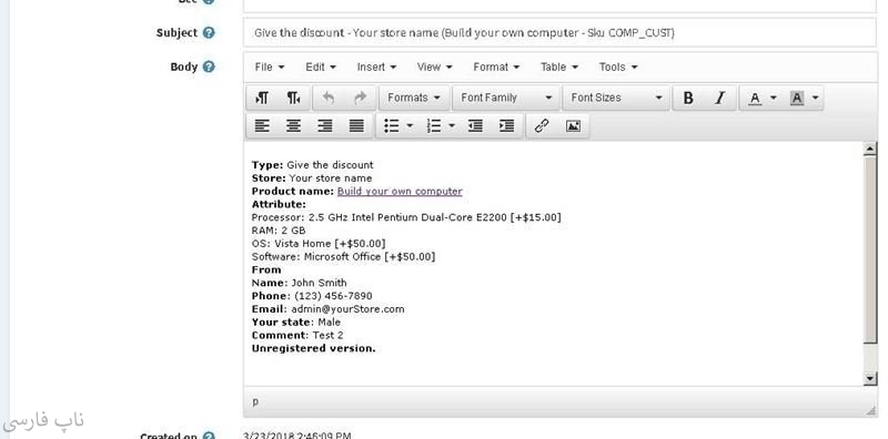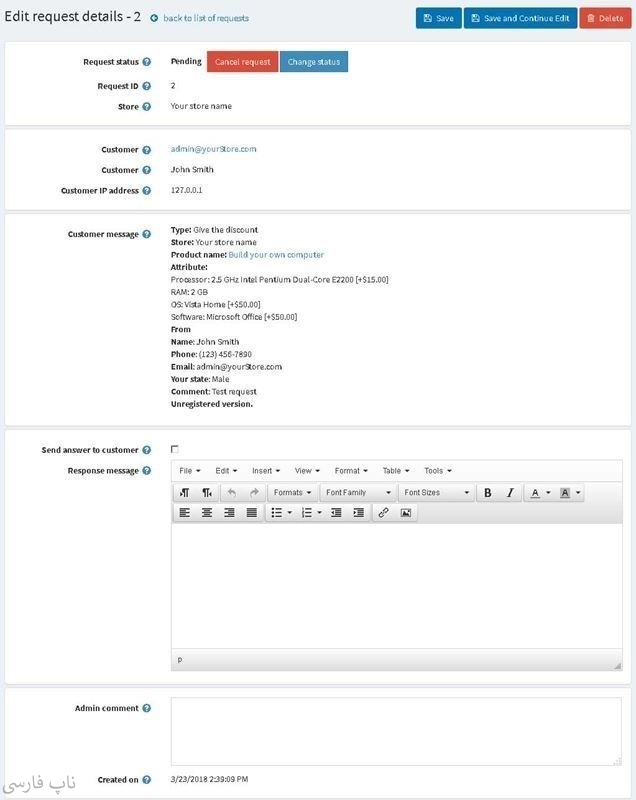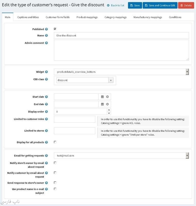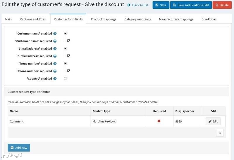 6- امکان مشخص کردن متغیرهای فرم درخواست‌ها. صاحب فروشگاه می‌تواند مشخص کند که چه اطلاعاتی را باید از مشتری دریافت کند.