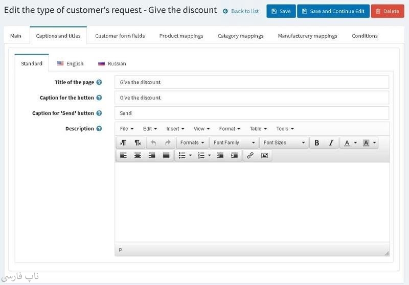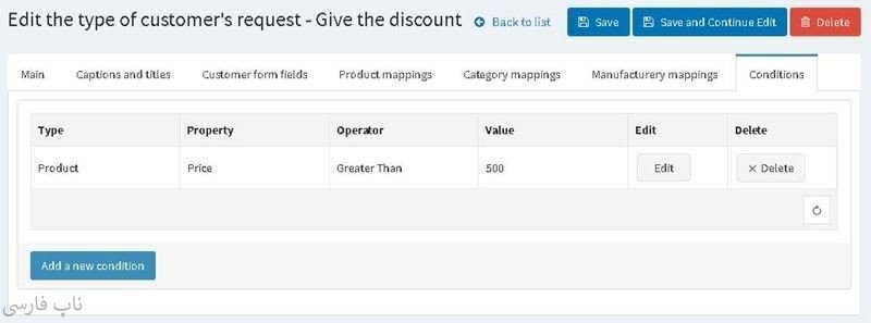 7- امکان تعریف "شرایط". صاحب فروشگاه امکان تعریف شرایط خاص برای نمایش دکمه ارسال درخواست را دارد. به عنوان نمونه دکمه ارسال درخواست فقط برای محصولاتی به نمایش درخواهد آمد که موجودی آنها به اتمام رسیده است.