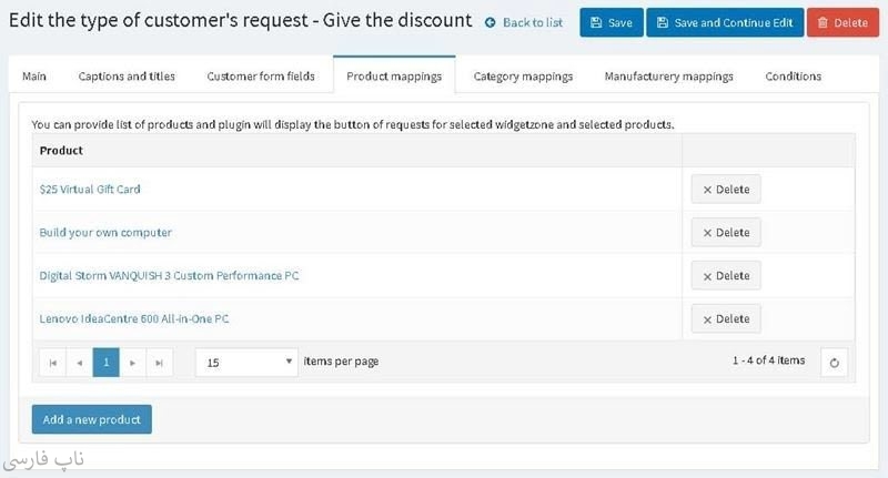 به عنوان نمونه صاحب فروشگاه می‌تواند برای محصولات دسته‌بندی کتاب، دکمه1 را تعریف کند که فرم درخواست تخفیف را نشان خواهد داد.