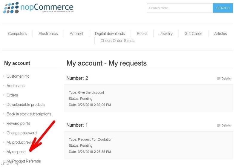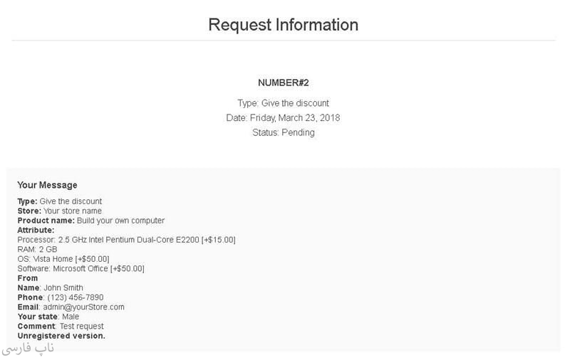 با استفاده از این افزونه، صاحب فروشگاه می‌تواند این امکان را به مشتریان خود بدهد تا درخواست‌ها و سؤالات خود را برای محصولات مختلف ارسال کنند. صاحب فروشگاه امکان قرار دادن دکمه "ارسال درخواست" را در هر نقطه از صفحه دارد. همچنین صاحب فروشگاه می‌تواند مشخص کند که این دکمه برای چه محصولات و در چه دوره زمانی قابل مشاهده باشد. به عنوان نمونه دکمه "ارسال درخواست" برای محصولات موجود در دسته‌بندی کتاب‌ها در دوره زمانی 12 دی ماه تا 20 بهمن ماه به نمایش در خواهد آمد.