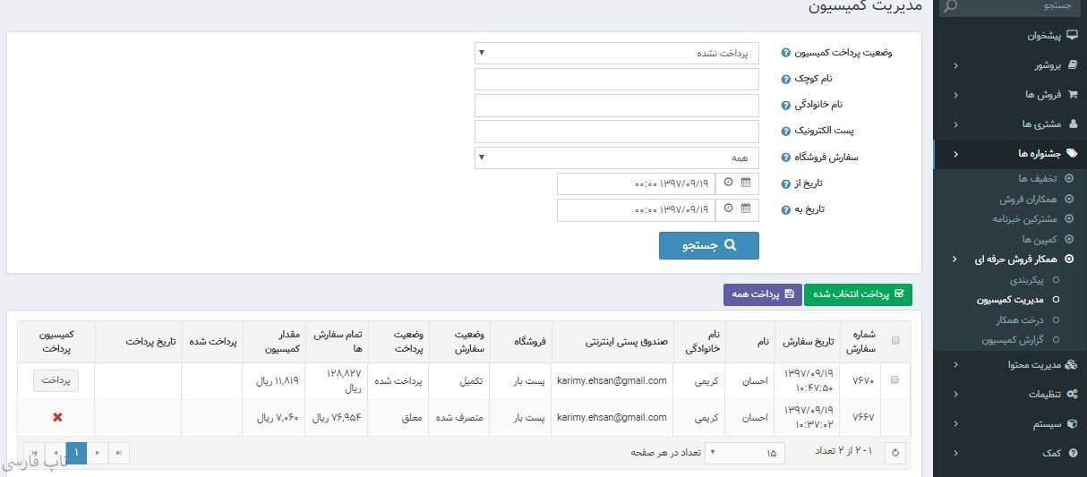 بازاریاب می تواند تمام سفارشات را مشاهده کند و توسط لینک وابسته خود قرار داده شود.