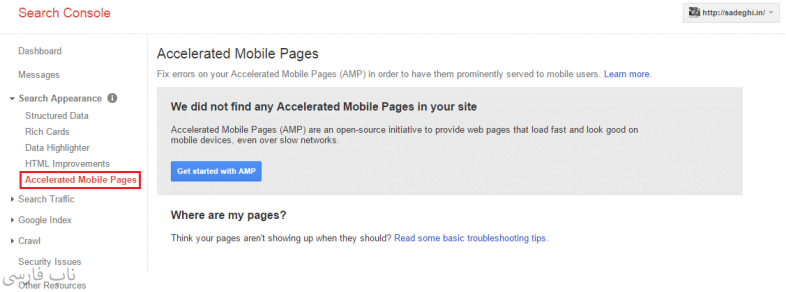 برای اینکه بدانید سایت شما دارای چه نسخهای از AMP ناپ کامرس در گوگل است، وارد کنسول گوگل سایت خود شده و در بخش Accelerated Mobile Pages مشابه تصویر زیر، با مراجعه به این بخش میتوانید این صفحات را مانیتور کرده و در صورت وجود خطا در آنها، از طریق همین بخش از این مسئله آگاه شوید و نسبت به برطرف کردن خطاهای اعلام شده اقدام کنید.