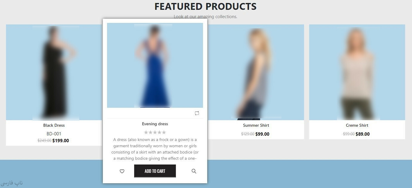 - جعبه محصولات با قابلیت تغییر اندازه: جعبه محصولات قرار داده شده در این قالب (محدودهای که توضیحات و تصویر محصولات در صفحات دیگر به نمایش در میآیند) با طراحی جدید و به روز بوده و به مشتریان این قابلیت را میدهد تا با نگه داشتن نشانگر خود بر روی تصویر محصول، اندازه جعبه محصول به صورت خودکار بزرگتر شود تا مشتریان بتوانند اطلاعات بیشتری از محصولات را مشاهده کنند.