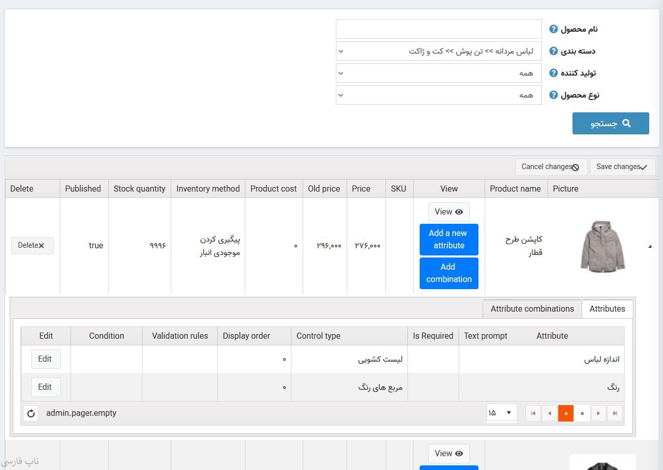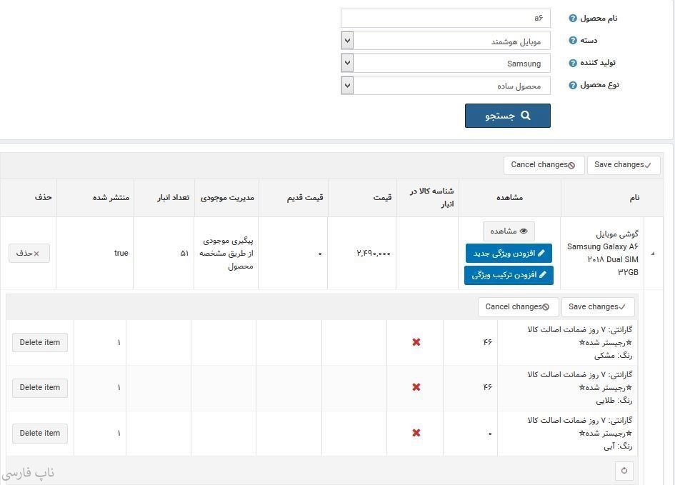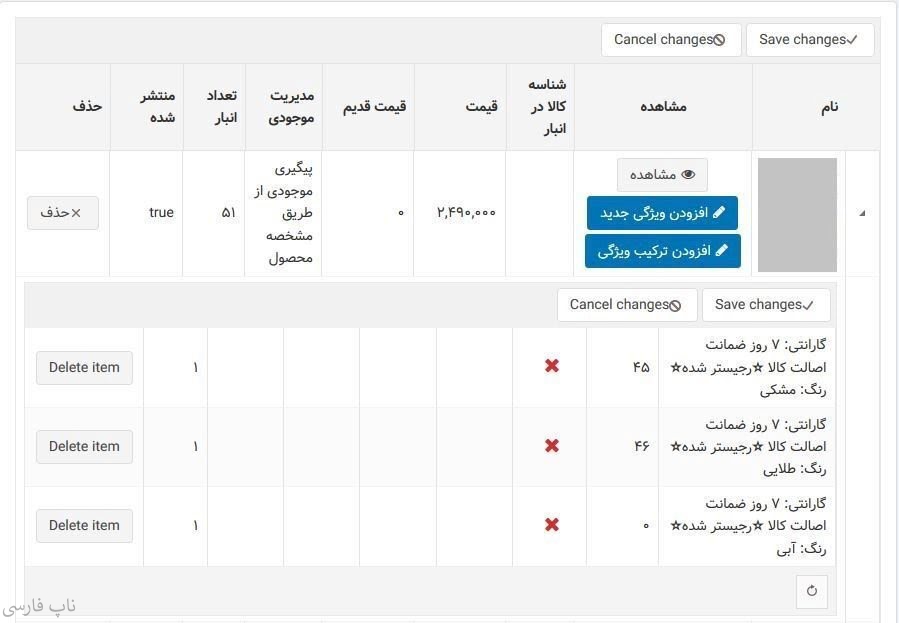 ویرایش جزئیات و ویژگی‌های محصولات و ویژگی های ترکیبی در یک صفحه.