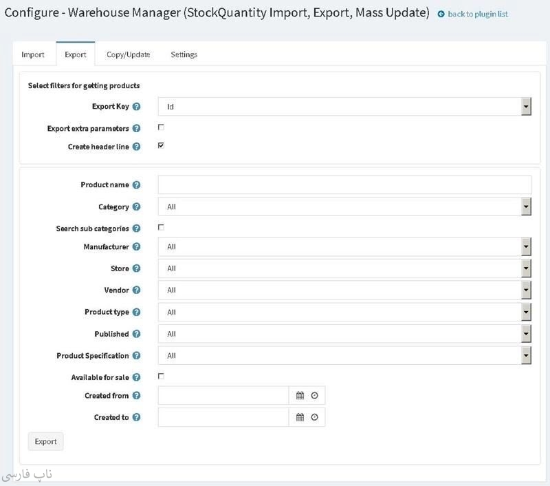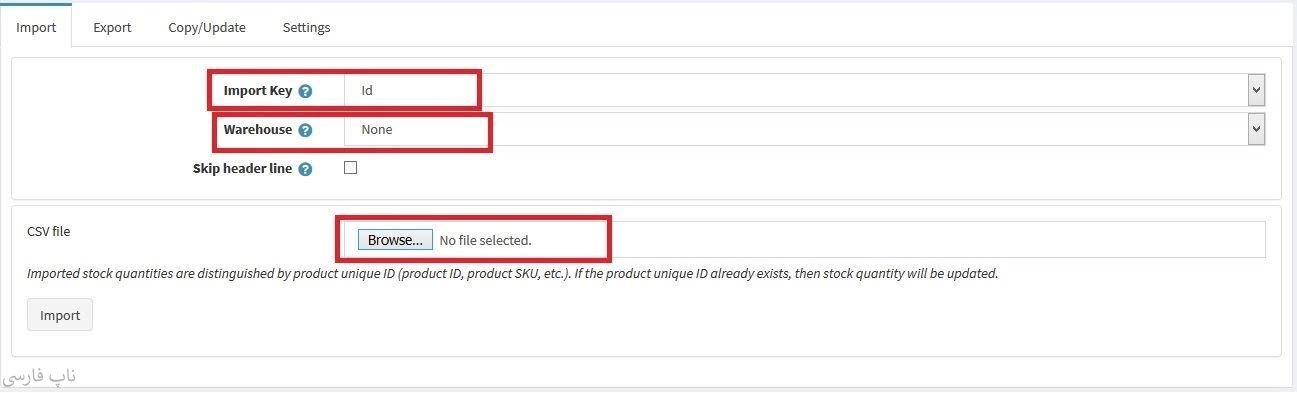 1- Export: افزونه یک فایل CSV ساده با محتوای Id و تعداد موجودی تولید میکند. توانایی استفاده از کلیدهای دیگر محصولات (Id، SKU، GTIN، شماره قطعه تولید کننده) برای تولید این فایلها نیز وجود دارد.