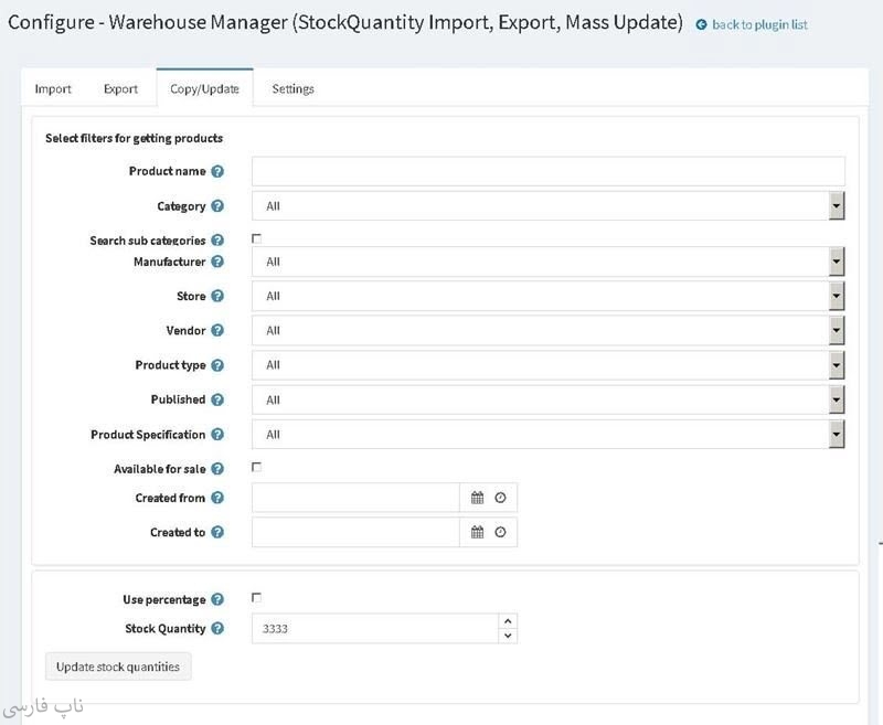 3- بهروزرسانی: افزونه این اجازه را میدهد تا تعداد موجودی محصولات در انبار را برای محصولات انتخاب شده بهروزرسانی کنید.