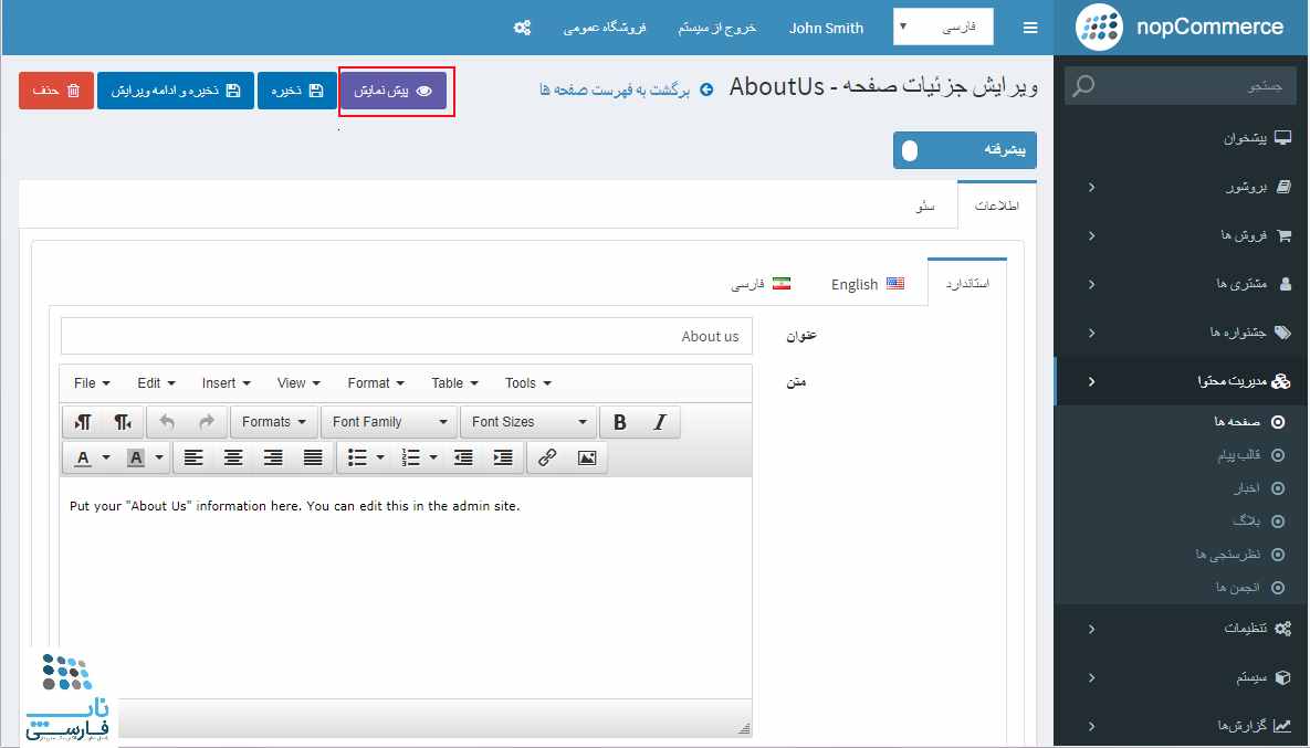 به عنوان صاحب فروشگاه در ناپ کامرس، ویژگی بعدی که در نسخه nopCommerce 4.10 بسیار ارزشمند می بینم، پیش نمایش در قسمت مدیریت برای اخبار، صفحهات و پست های وبلاگ است. در نسخه های قبلی ما مجبور بودیم برای مشاهده یک مقاله آن را منتشر کنیم. این به خصوص با مقالاتی که نیاز به قالب بندی گسترده داشت ناخوشایند بود. به عنوان مثال، تغییرات در یک پست وبلاگ، هنگامی که آن را همه می بینند، یک عمل خوب نیست. خوشبختانه در فروشگاه nopCommerce 4.10 این مشکل حل شده است و صاحبان فروشگاه ها می توانند مطالب خود را تا حدی که نیاز دارند قبل از انتشار آن ویرایش و طراحی کنند.