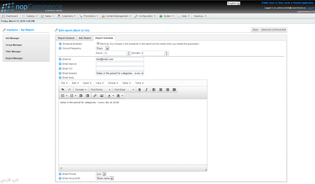 - قابلیت تنظیم زمانبند برای تولید و ارسال خودکار گزارشها. این تولید خودکار گزارشها میتواند در دورههای مشخص همانند سالانه، ماهانه، هفتگی، روزانه، ساعتی و حتی دقیقهای باشد.
