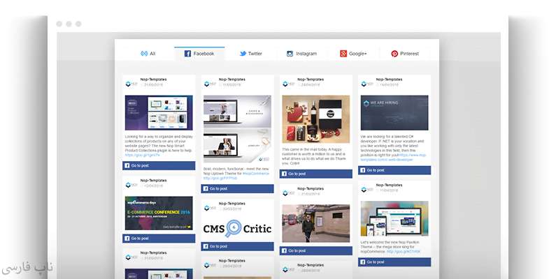 با استفاده از افزونه "نمایش پستهای شبکههای اجتماعی" شما این قابلیت را پیدا میکنید که پستهای شبکه اجتماعی خود را در هر صفحه از فروشگاه خود به نمایش دربیاورید. این افزونه با شبکههای اجتماعی مانند Facebook، Twitter، Pinterest، Instagram، Google+ و... همخوانی دارد.