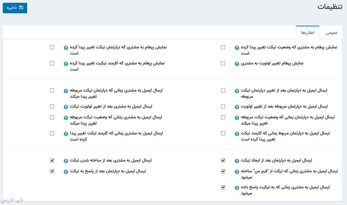 صاحبان فروشگاه این قابلیت را خواهند داشت تا مشخص کند که در زمان دریافت تیکت، به روز رسانی تیکت، تغییر وضعیت تیکت، تغییر اولویت تیکت، تغییر دپارتمان تیکت، تغییر کارمند تیکت و پاسخ به تیکت به مشتری، دپارتمان مربوطه و کارمند مربوطه به صورت خودکار ایمیل ارسال شود تا همه افراد مربوطه از وضعیت تیکت‌ها اطلاع داشته باشند.