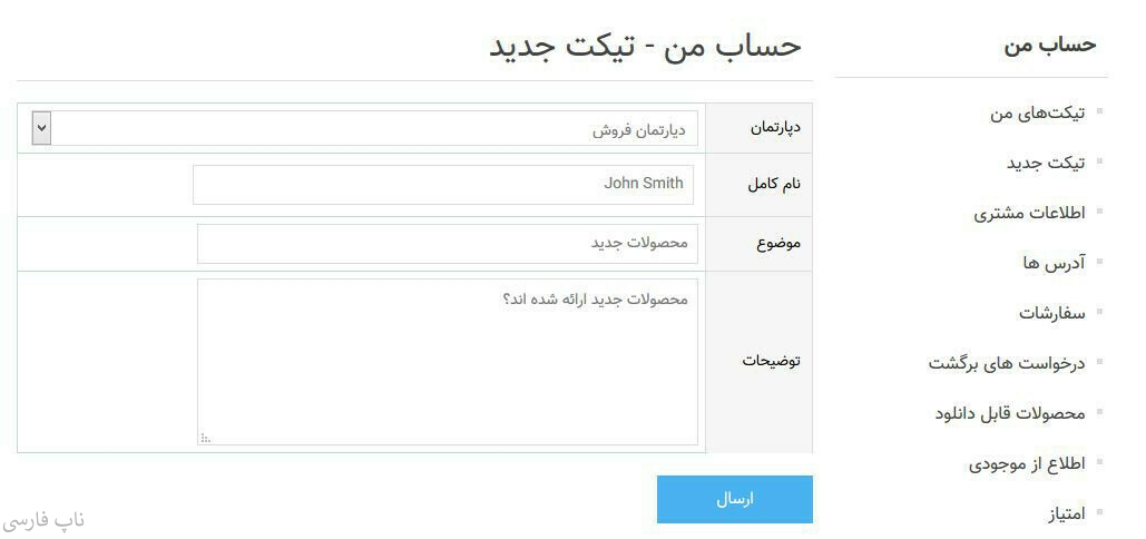 امکان ارسال تیکت توسط مشتریان / کاربران از صفحات زیر: