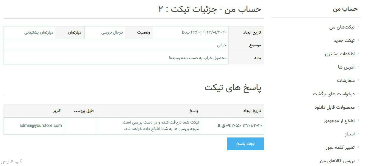 در صورت پاسخ به تیکت مشتریان توسط کارمندان فروشگاه، یک ایمیل اطلاع دهنده به صورت خودکار به مشتری ارسال می‌شود. مشتریان امکان مشاهده پاسخ‌ها و جزئیات مربوط به تیکت‌های خود را در صفحه حساب کاربری خود را دارند. مشتریان امکان اضافه کردن نظرات بیشتر را به تیکت‌های قبلی خود دارند.