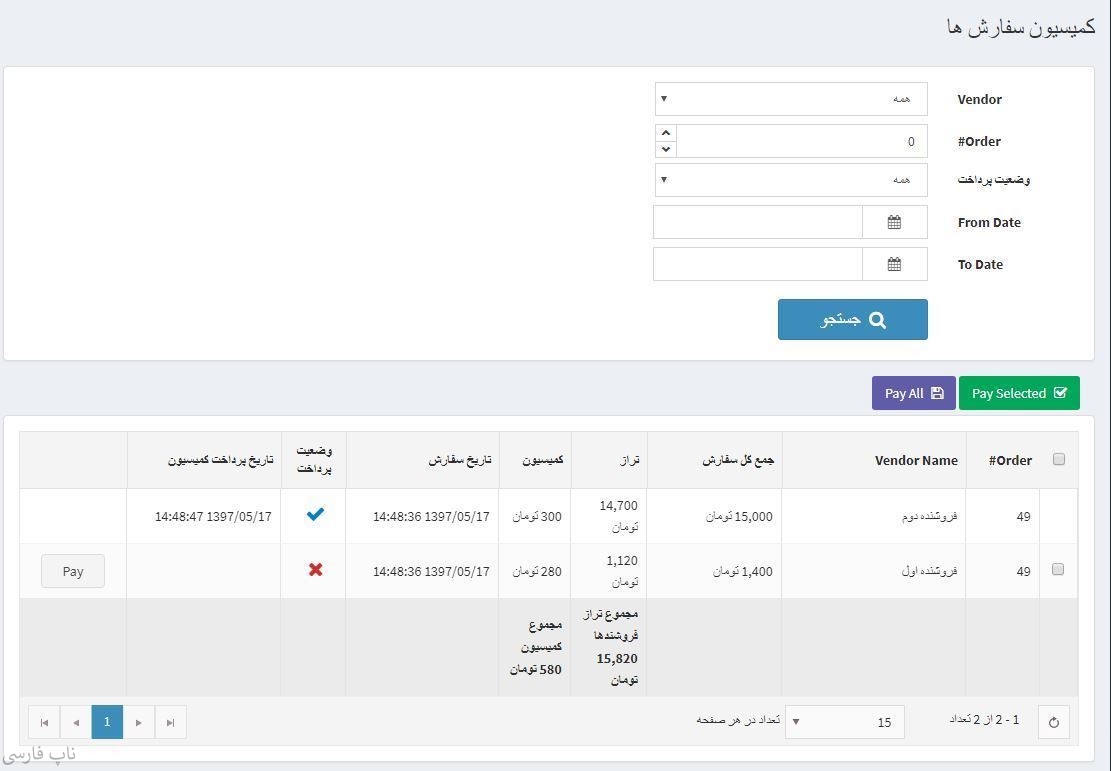 - صاحب فروشگاه می تواند تمام کمیسیون ها را برای همه فروشندگان مشاهده کند. این گزارش بر اساس فروشنده، شناسه سفارش، از تاریخ، تا تاریخ، قابل فیلتر و جستجو است.